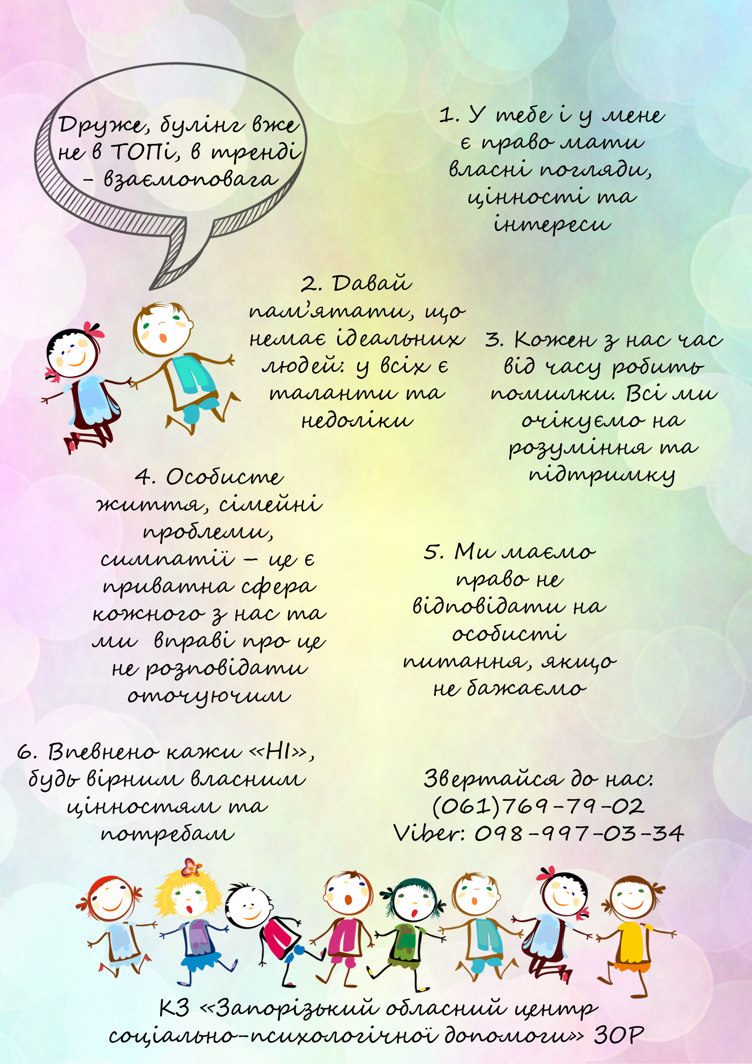 Комунальним закладом "Запорізький обласний центр соціально-психологічної допомоги "Запорізької обласної ради була розроблена інформаційна листівка-плакат "Я, Ти, Ми - Є" з метою підвищення самоповаги та розвитку "нульової" толерантності до булінгу.