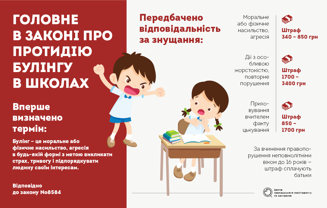 Нещодавно в Україні з’явився закон, який визнає термін “булінг”, як моральне або фізичне насильство іншої людини. З цим законом з’явилась і нова стаття в Адміністративному кодексі України, згідно з якою за булінг карають. З початку в поліції навіть не знали як буде проходити процедура складання протоколу, та як будуть доводити це порушення.